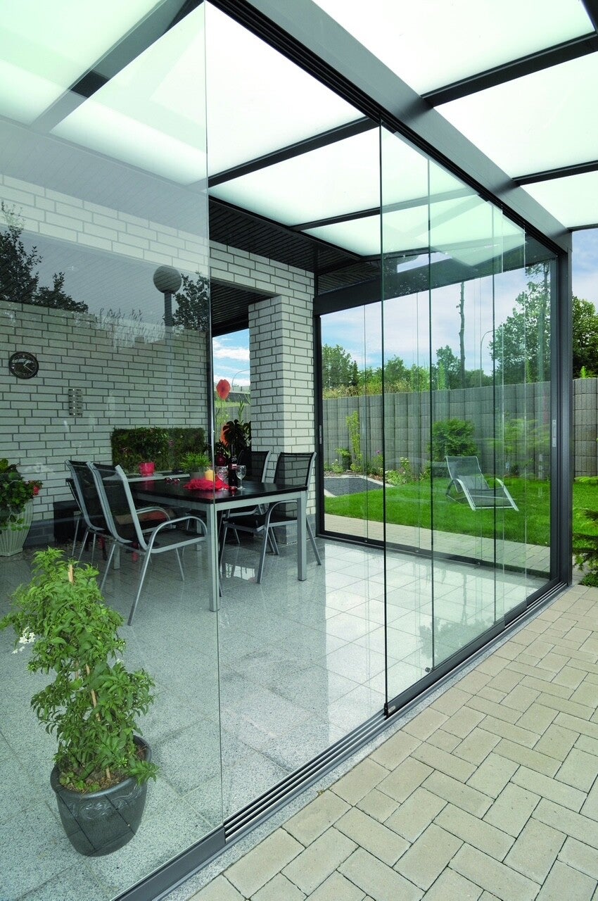 Sistema ideale per terrazze e verande esterne, dove è possibile godere di spazi esterni, con luminosità totale e vista panoramica, grazie all’apertura totale dei pannelli in vetro senza profili.